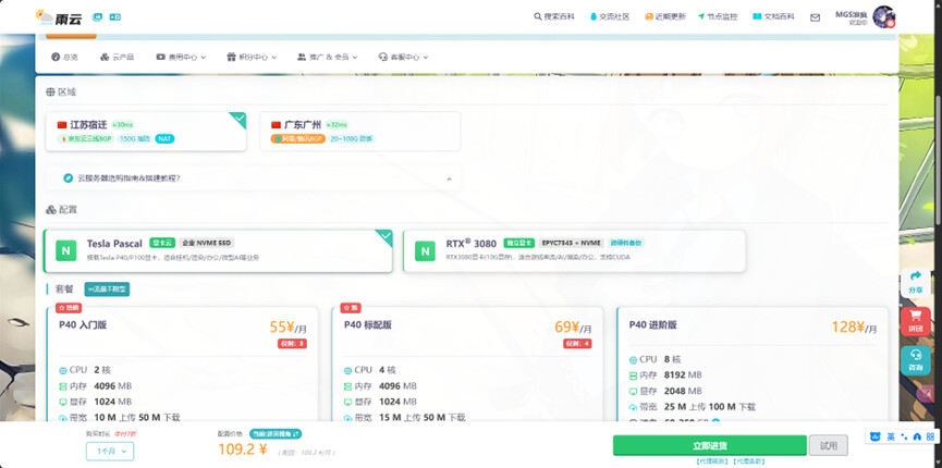 我们推荐选择带有 GPU 的云服务器,以获得更好的推理性能。本次示例选择的是 宿迁地区的 Tesla 系列 GPU 服务器。