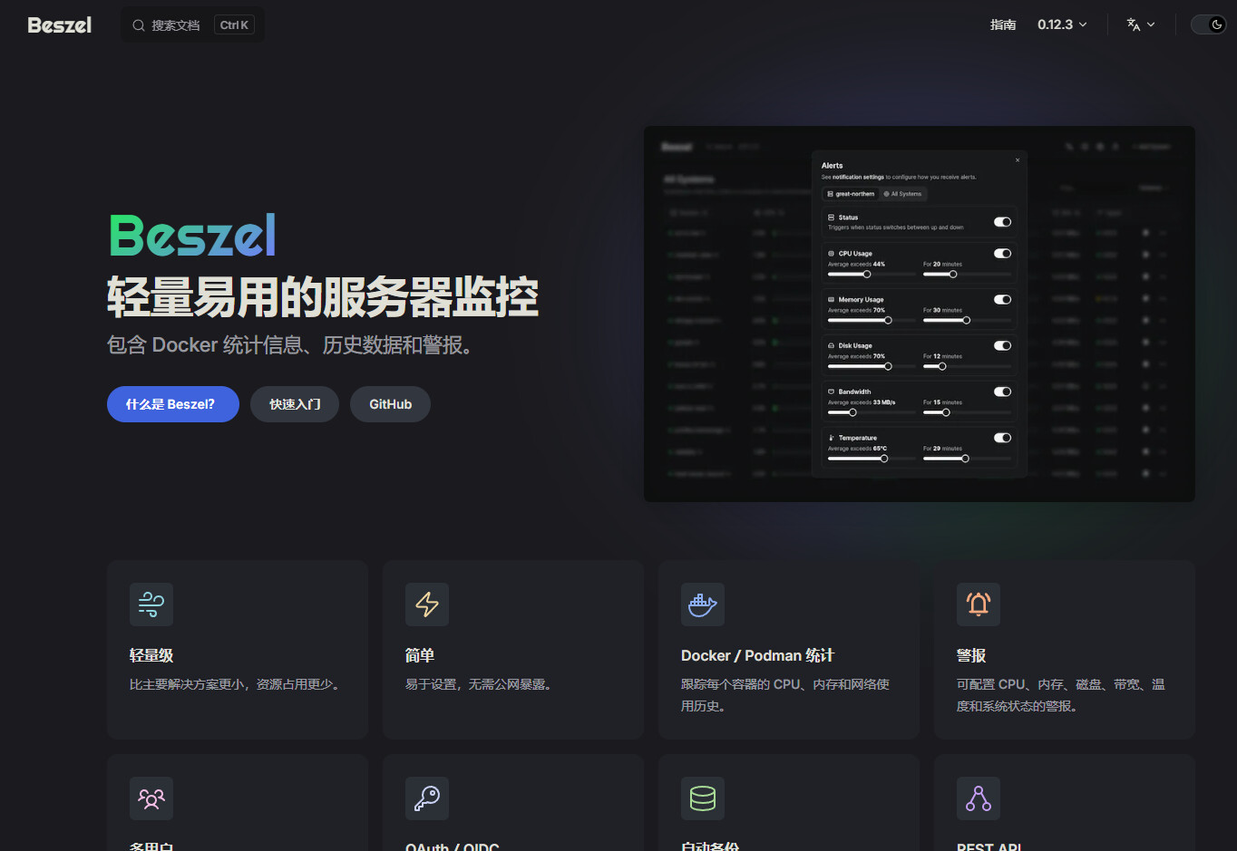Beszel 是一个现代化的轻量级服务器监控平台,专为开发者和系统管理员设计。它采用客户端-服务器架构,能够实时监控服务器资源使用情况、Docker容器状态,并提供历史数据分析和警报功能。