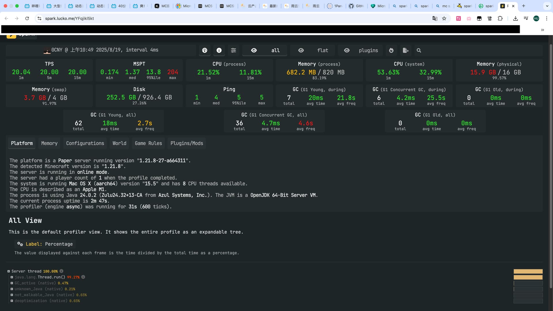 插件简介:Spark是一个性能分析插件,管理员可以通过火焰图精准定位服务器卡顿源头,在Paper服务端中已内置。