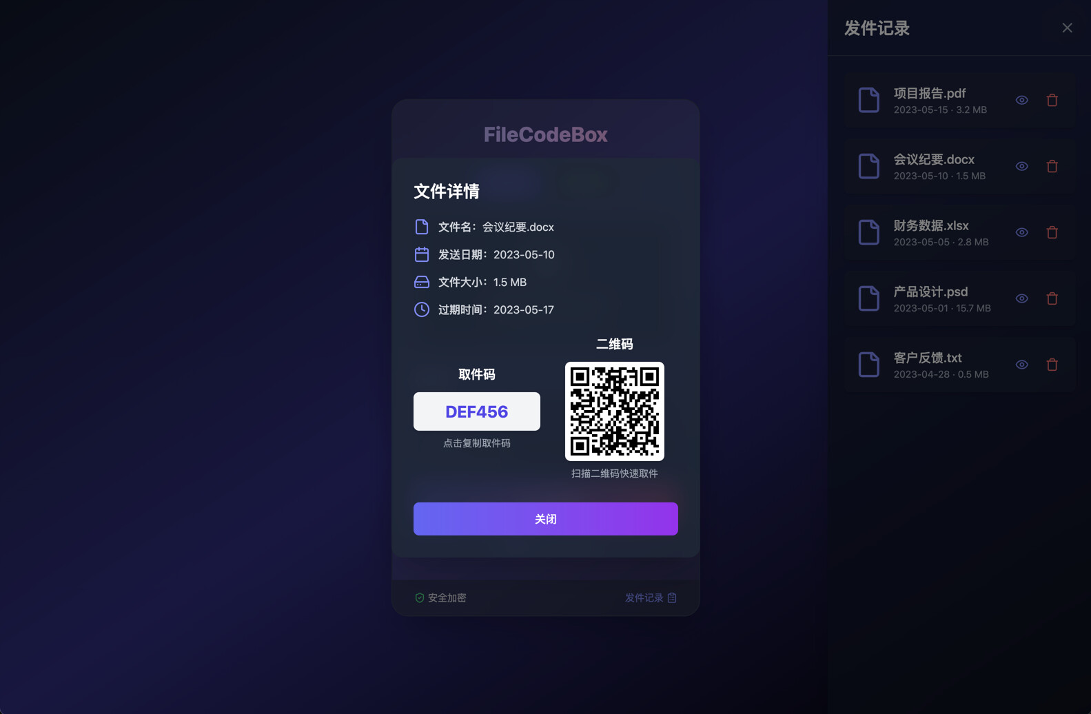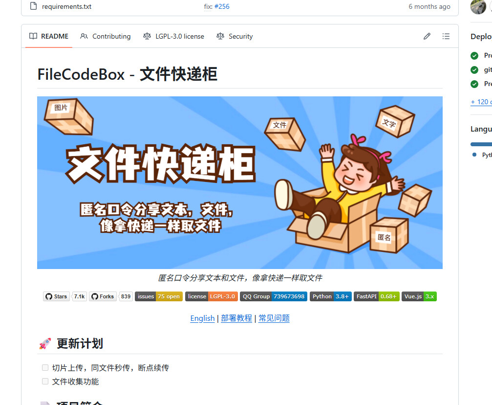 FileCodeBox 是一个基于 FastAPI + Vue3 开发的轻量级文件分享工具,允许用户通过提取码分享文本和文件,接收者只需输入提取码即可获取文件,如同从快递柜取件一般简单。