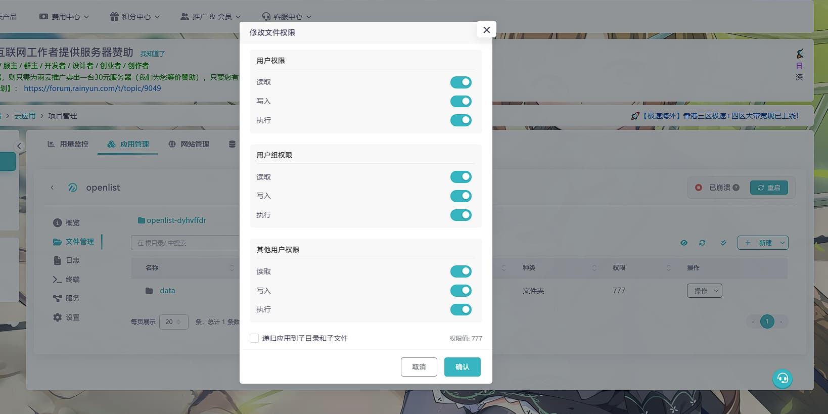 创建了一个openlist云应用,项目文件中上传的文件访问不了。文件管理也看不到openlist应用。
