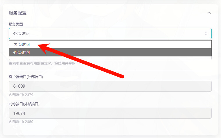 当我们只想对内网开放服务时,可以不要公网访问,只通过内部的 service 访问(K8S 概念,此处无需理解),此时我们只需要下滑页面,找到服务配置,把服务类型改成内部访问即可