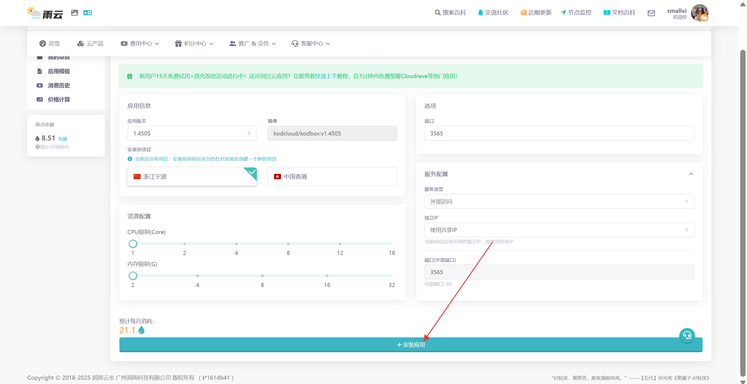 雨云为每位新用户赠送 10元免费资源额度  ,足够你免费部署一套完整的私有网盘系统。
