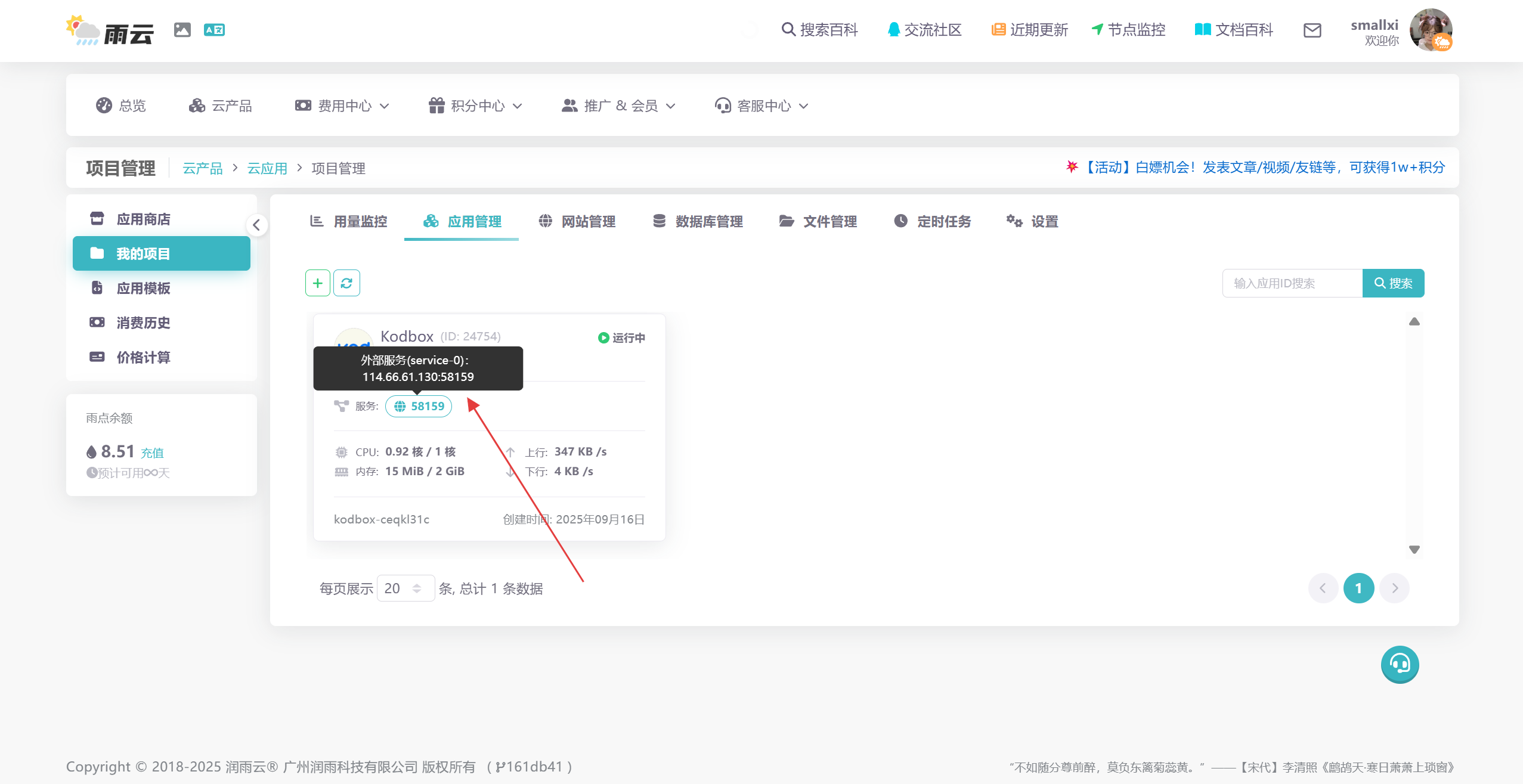 安装完成后,进入【我的项目】→【应用管理】查看 IP 和端口 安装完成后,进入【我的项目】→【应用管理】查看 IP 和端口