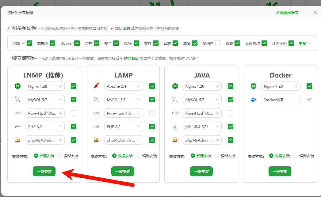 到初始化这一步,你直接点击 lnmp 的安装按钮即可