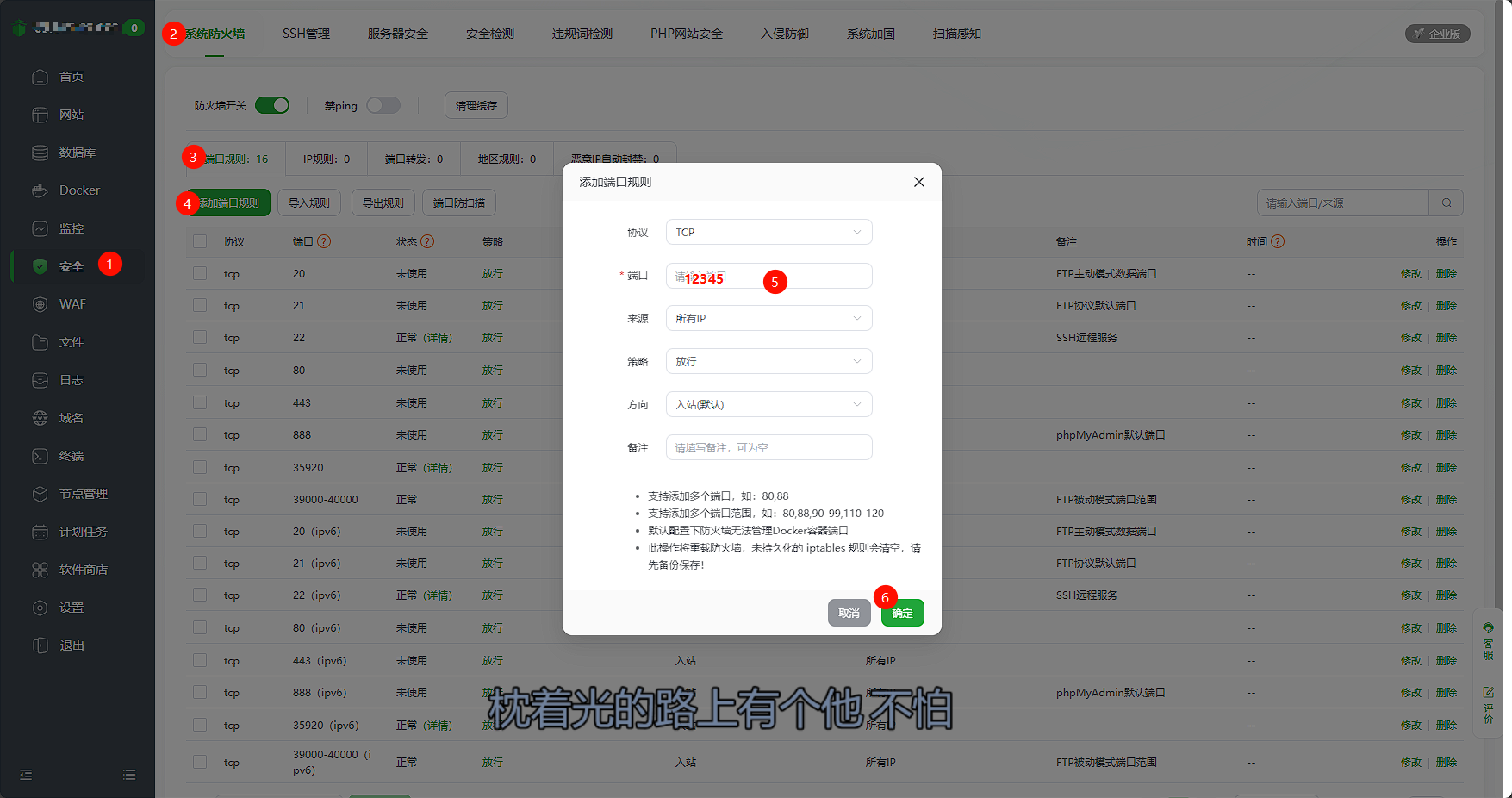 然后宝塔左边点击【安全】,【添加端口规则】,【端口】填12345,确定