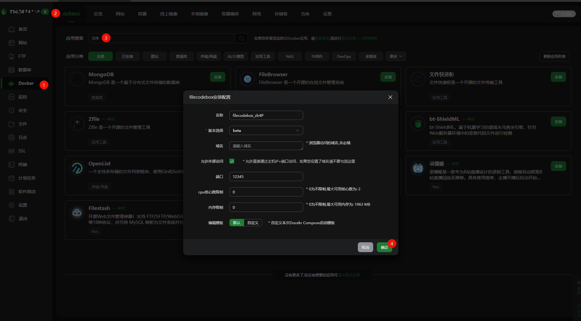 安装完成后,依旧是 docker,应用商店,搜索文件快递柜,找到对应的,点击安装