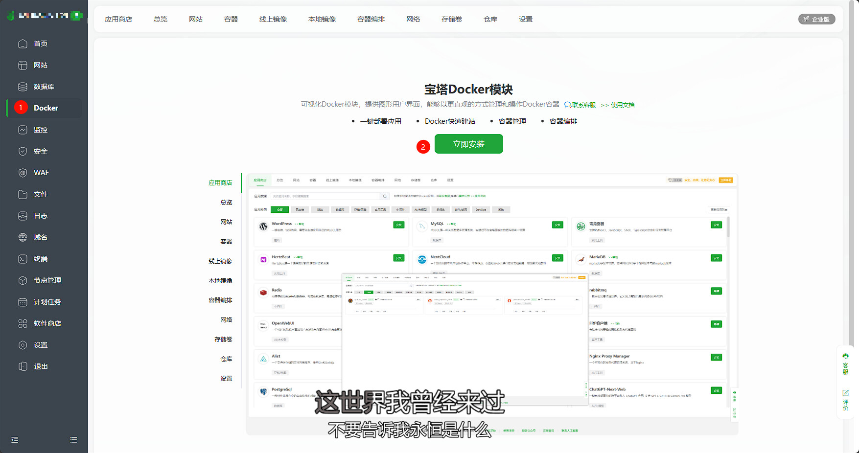然后点击左侧 docker ,立即安装