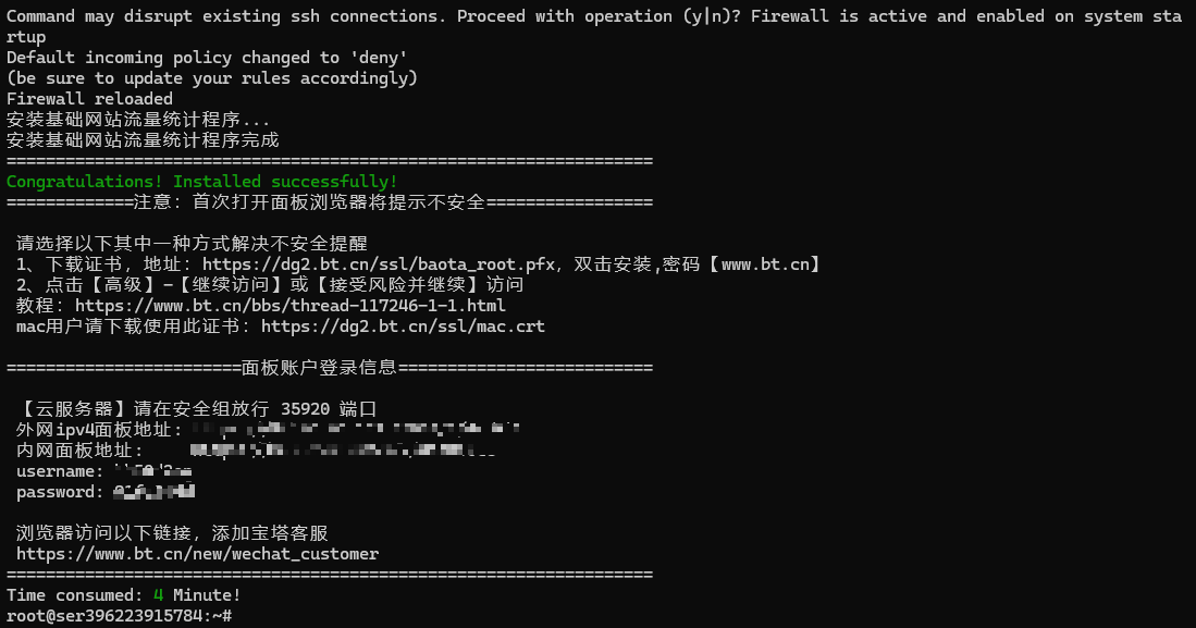 打开雨云自带的 ssh 连接工具,键入账密,使用下列命令安装宝塔面板