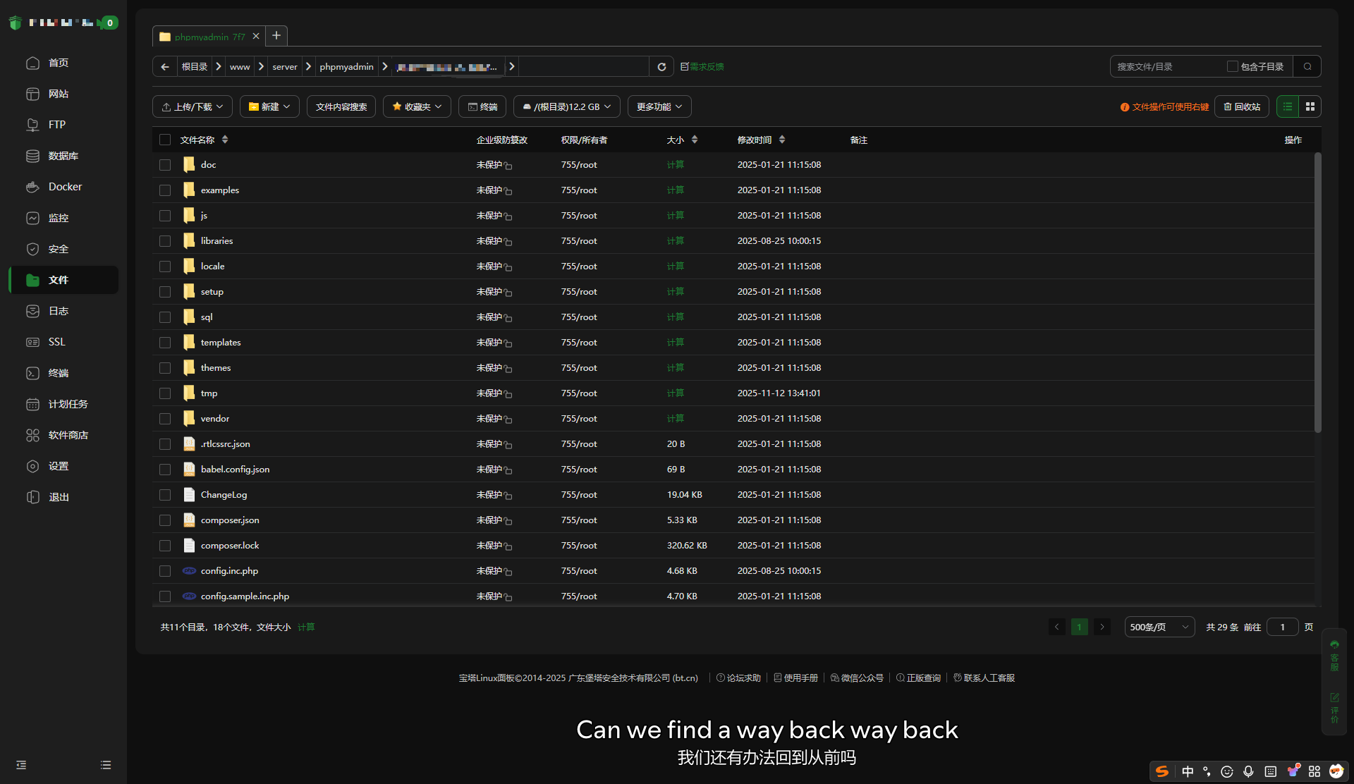 先进入 bt 的文件管理,进入 phpmyadmin 提示的无法访问的目录,不要进入 /tmp,应该会有以下文件