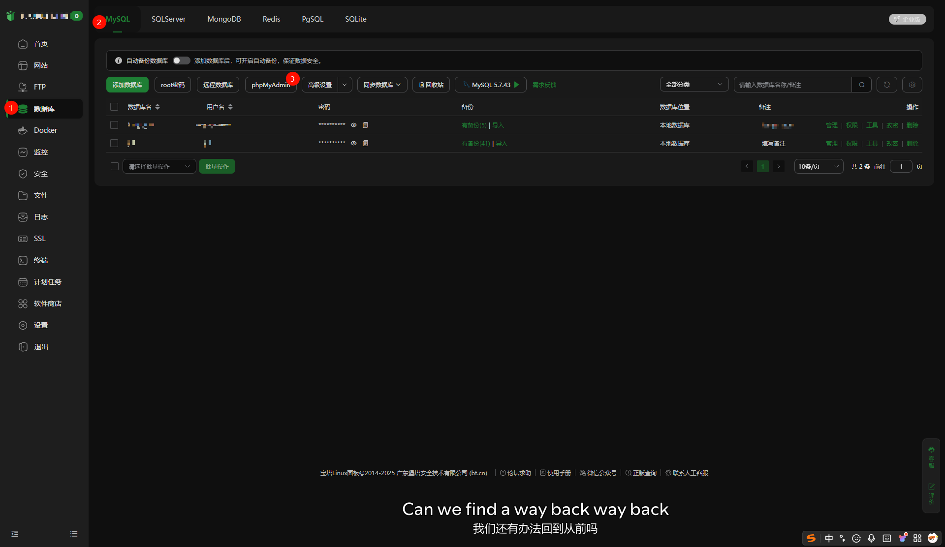 当你进入宝塔,选择数据库,选择 mysql ,进入 phpmyadmin
