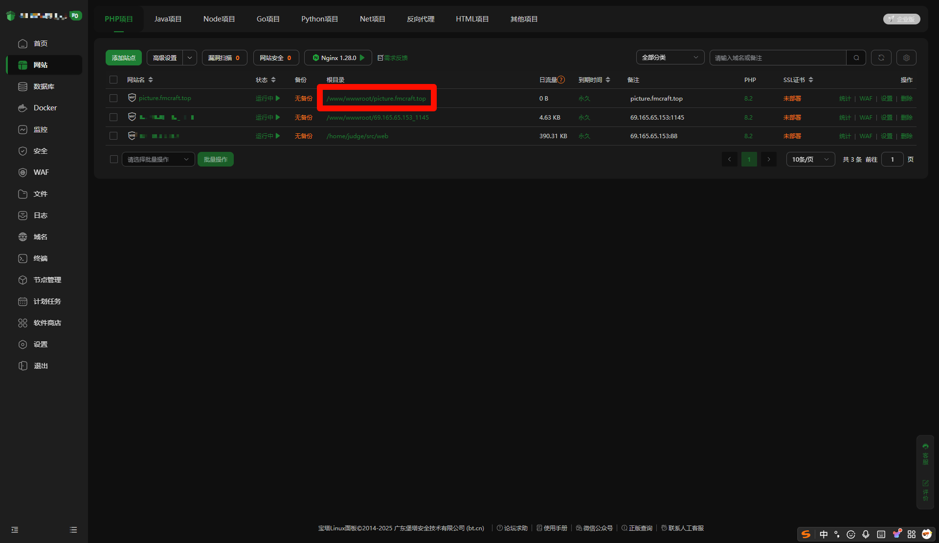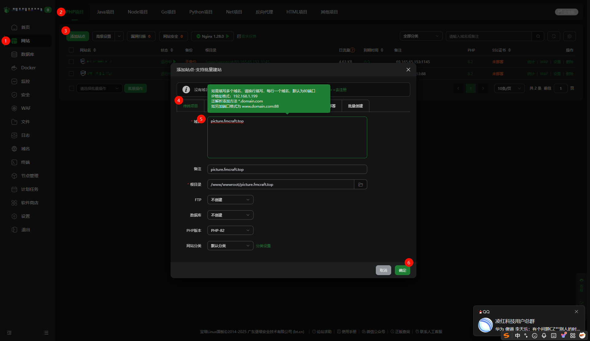 点击宝塔左侧网站,PHP 项目,添加站点