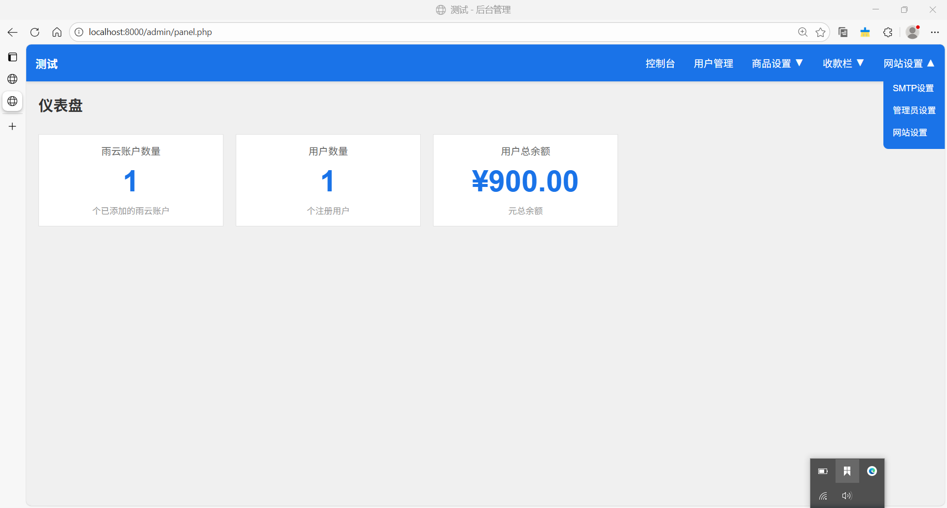 后台有smpt设置,注册设置,收款设置,网站设置,商品设置等功能
