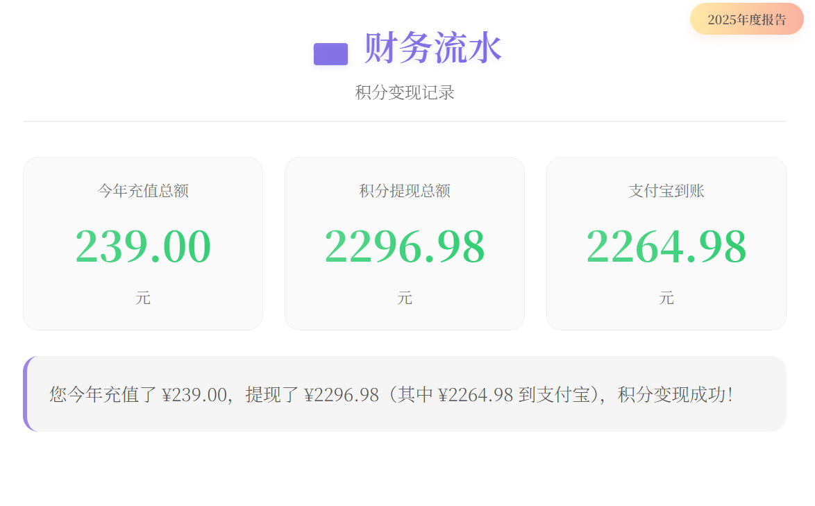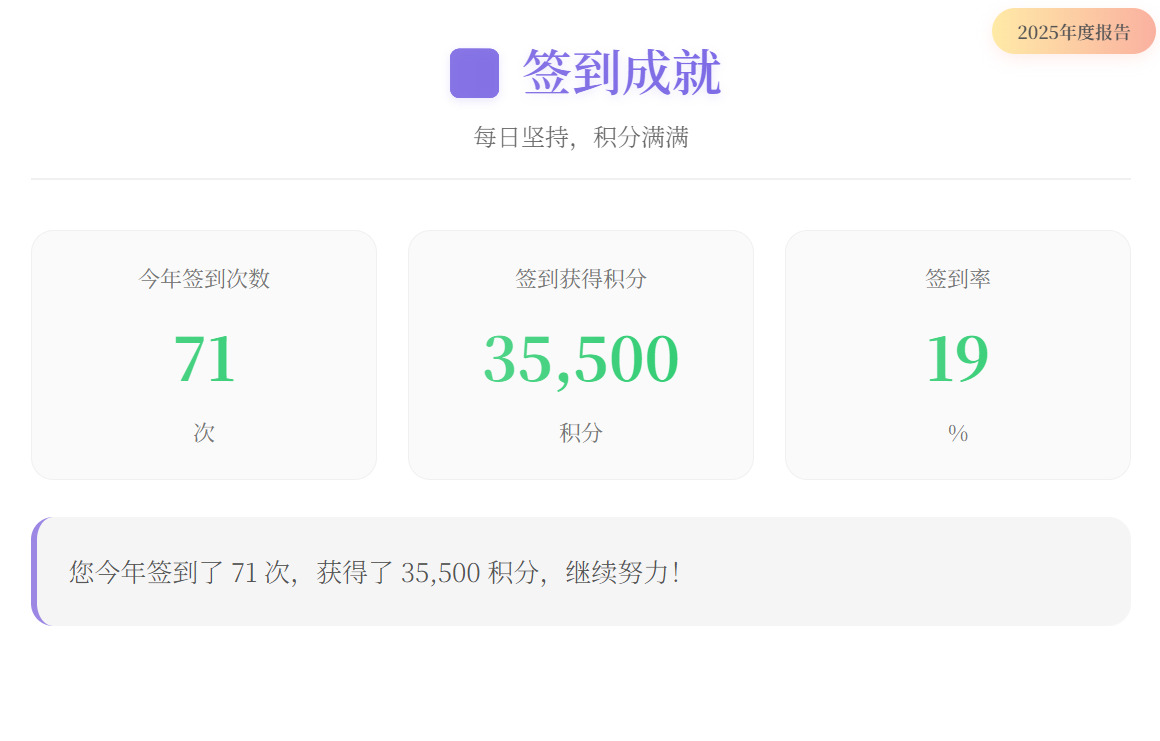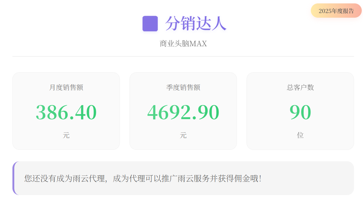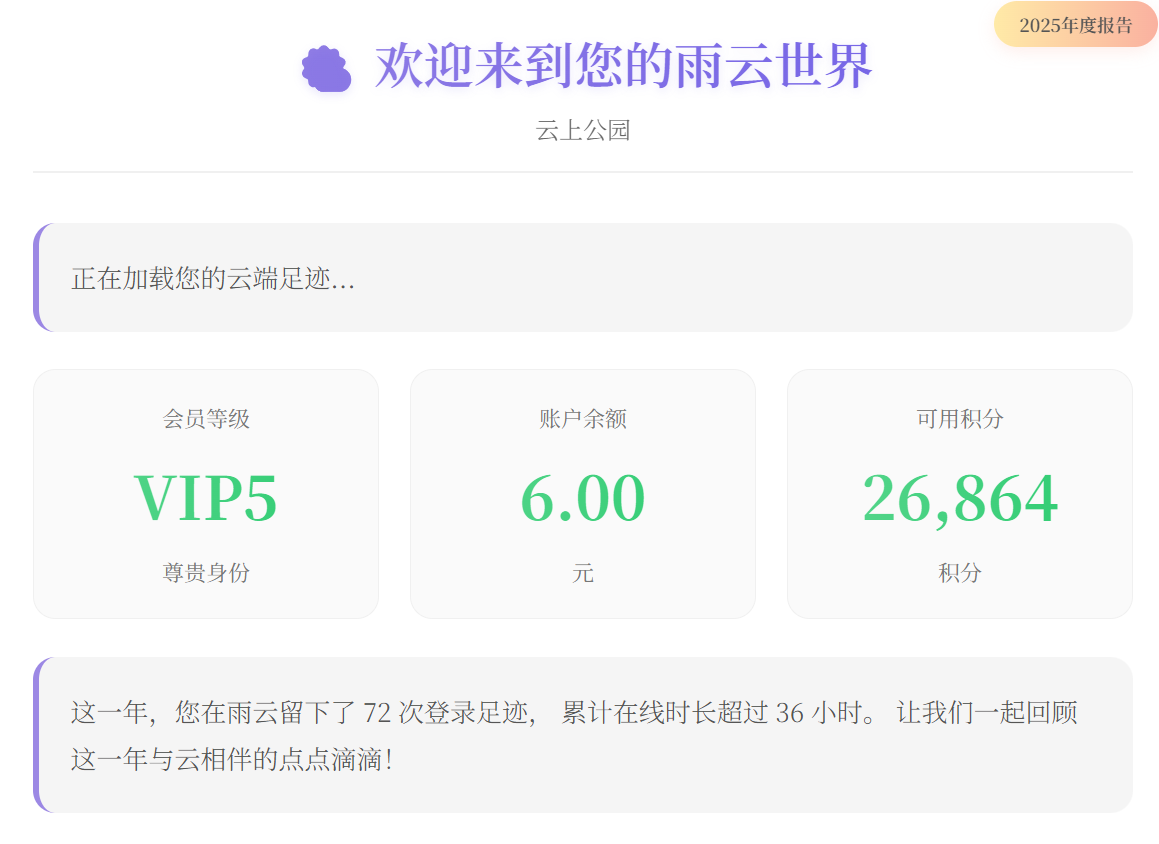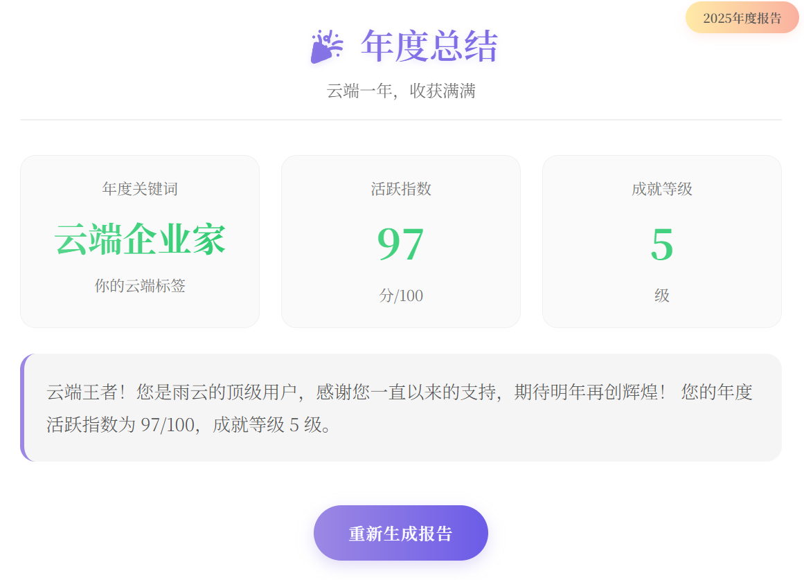 我的雨云2025年度报告: 会员等级:VIP5 签到次数:71次 登录次数:72次 季度消费:¥92.00 活跃指数:97/100 年度关键词:云端企业家 #雨云年度报告