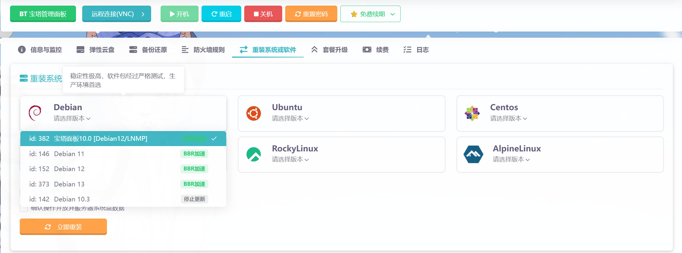 1.首先给云服务器装上系统:宝塔面板10.0[Debian12/LNMP]