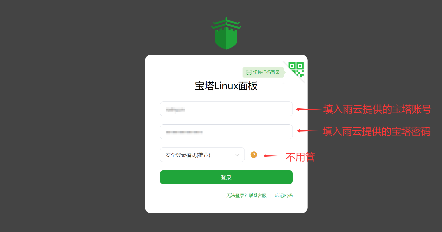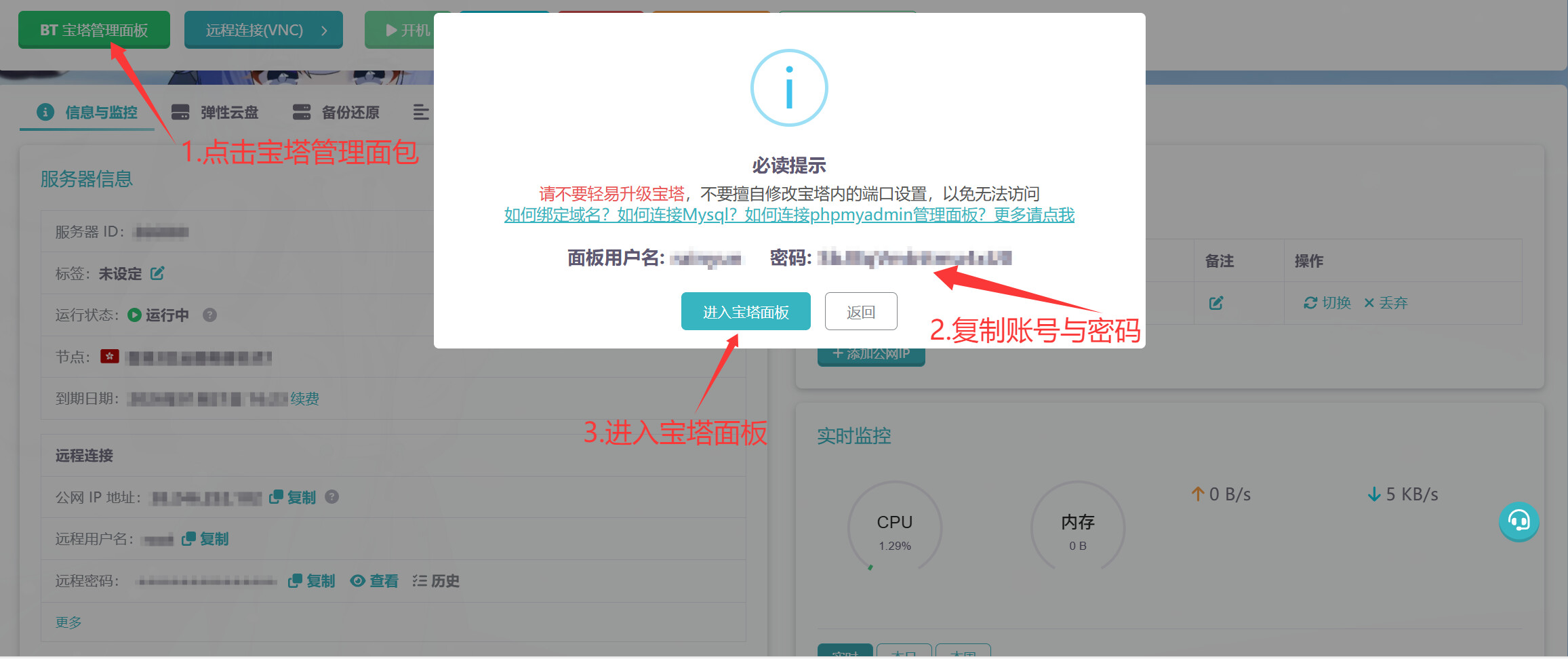3.复制雨云提供的宝塔账号与密码进入管理面板