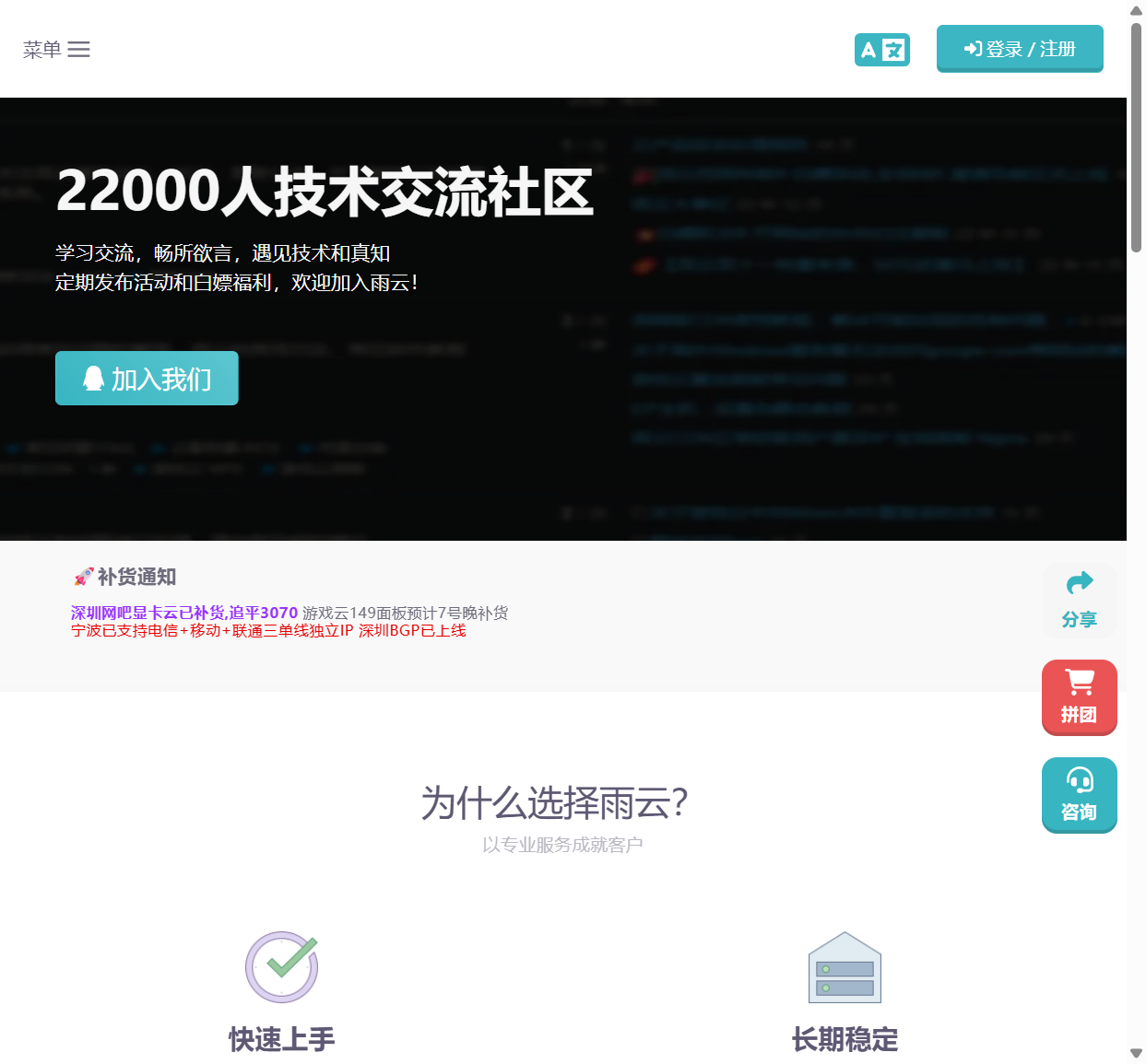 图 2:雨云官网 — 技术社区、补货通知与「为什么选择雨云」等介绍。