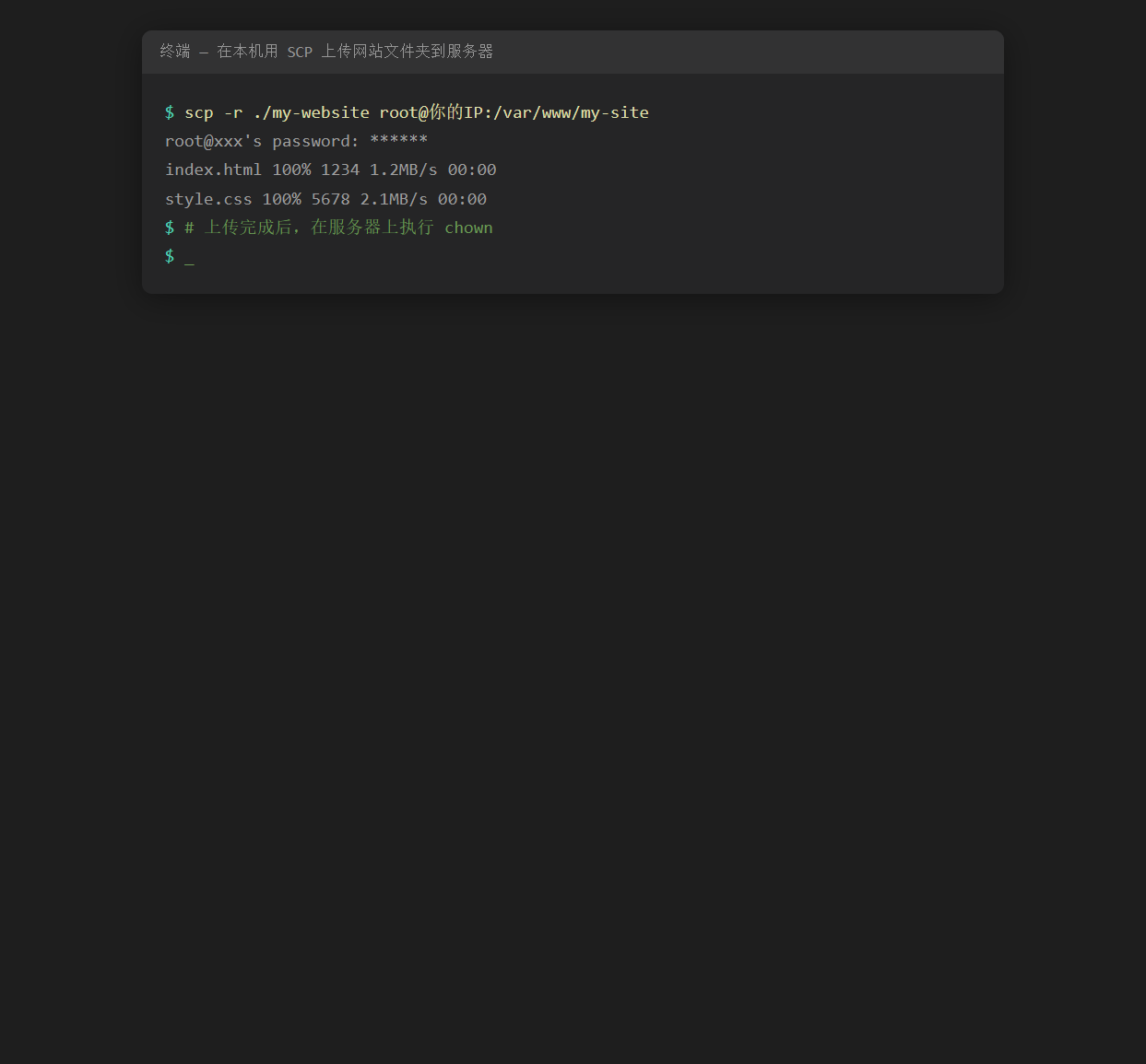 scp -r 你的网站文件夹 root@你的IP:/var/www/my-site