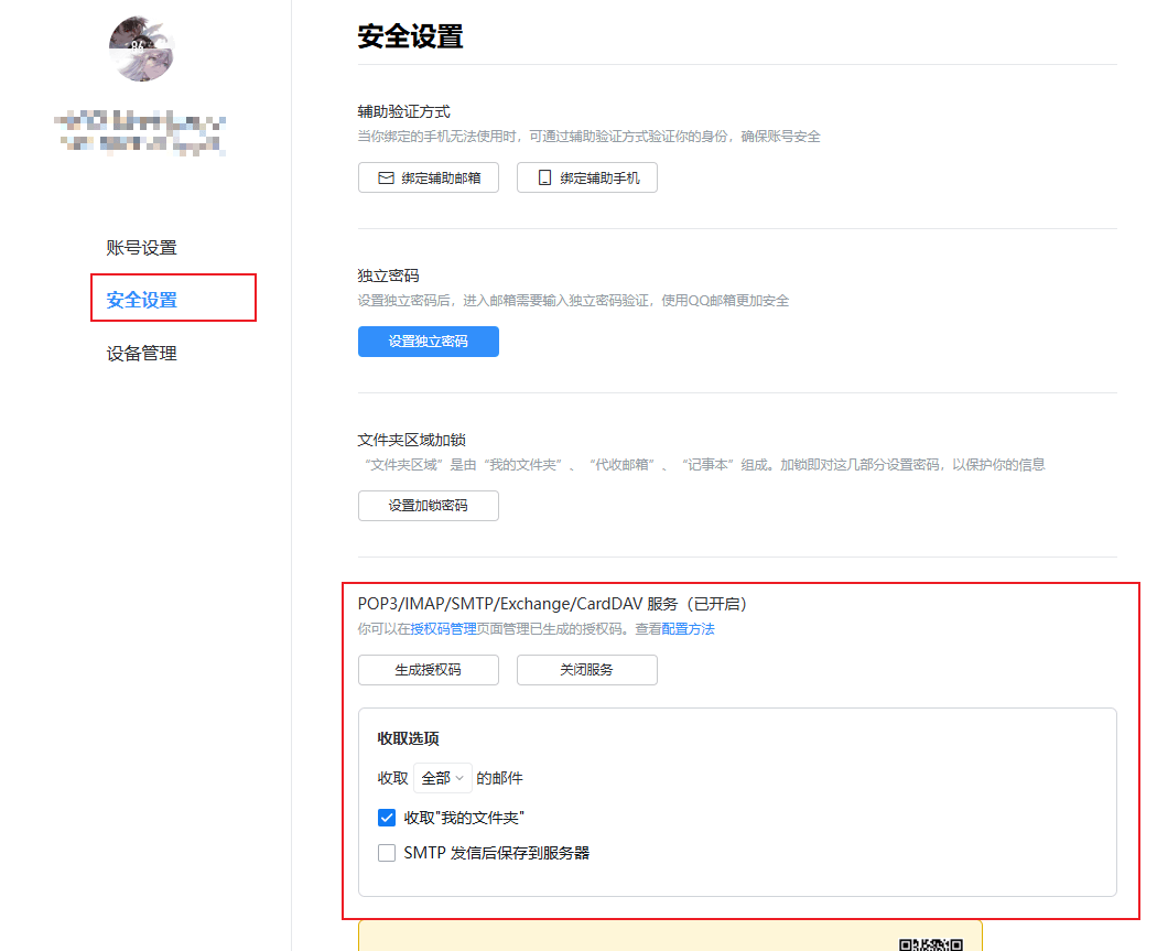 POP3/IMAP/SMTP/Exchange/CardDAV 服务,这里我是已经开启了,也已经生成过授权码了,这个授权码生成的时候要自己找个地方记住,因为只会显示一次