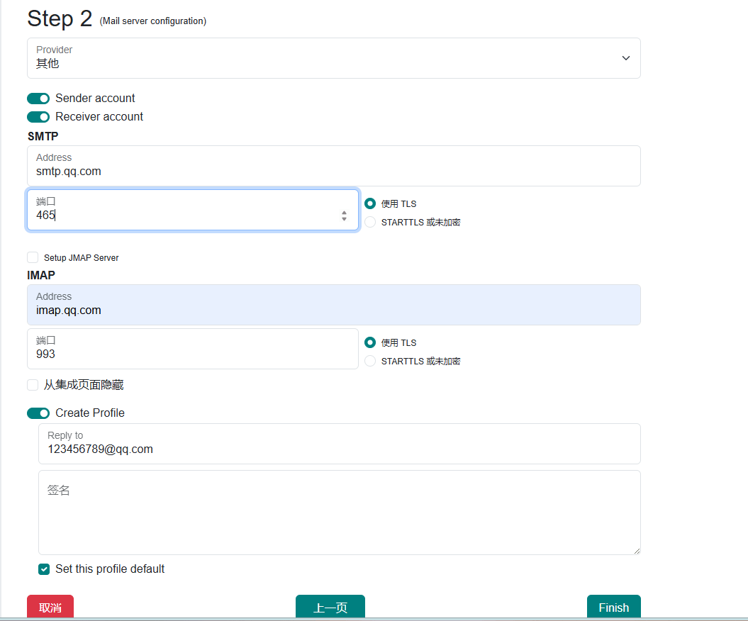 如果只是当做收件服务器的话就不用勾选Sender account,勾选的话可以在cypht里进行发件操作。