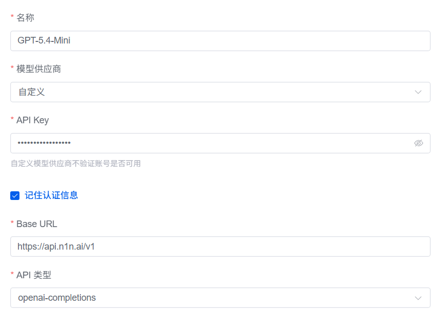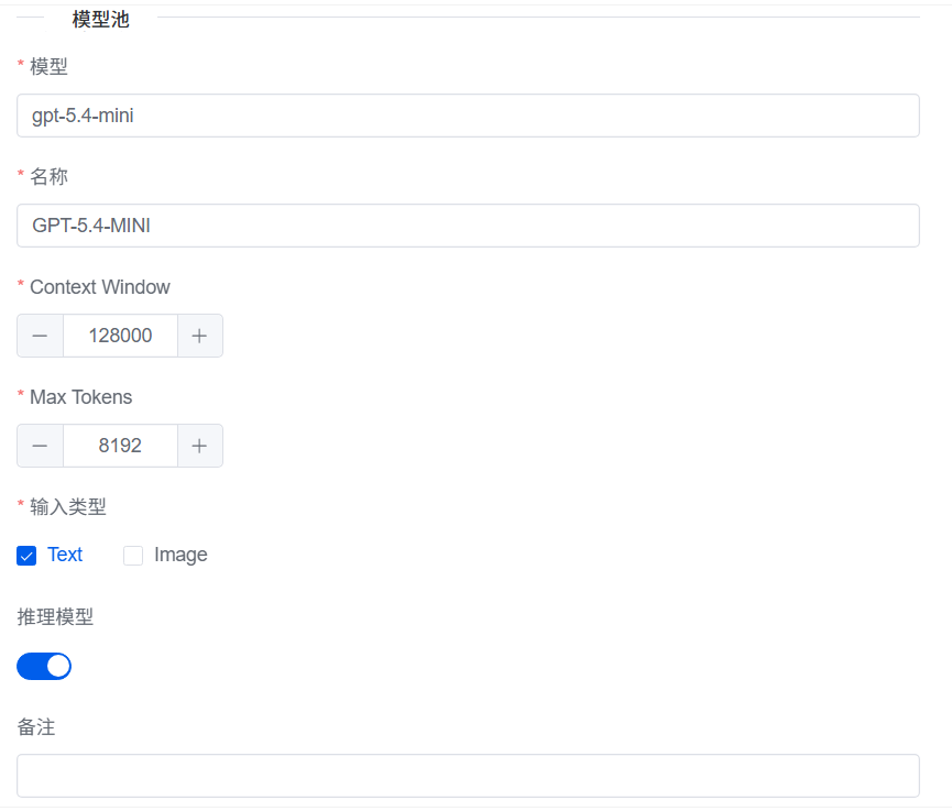 填入你的Key,模型和tokens limit。比如gpt-5.4-mini参考: