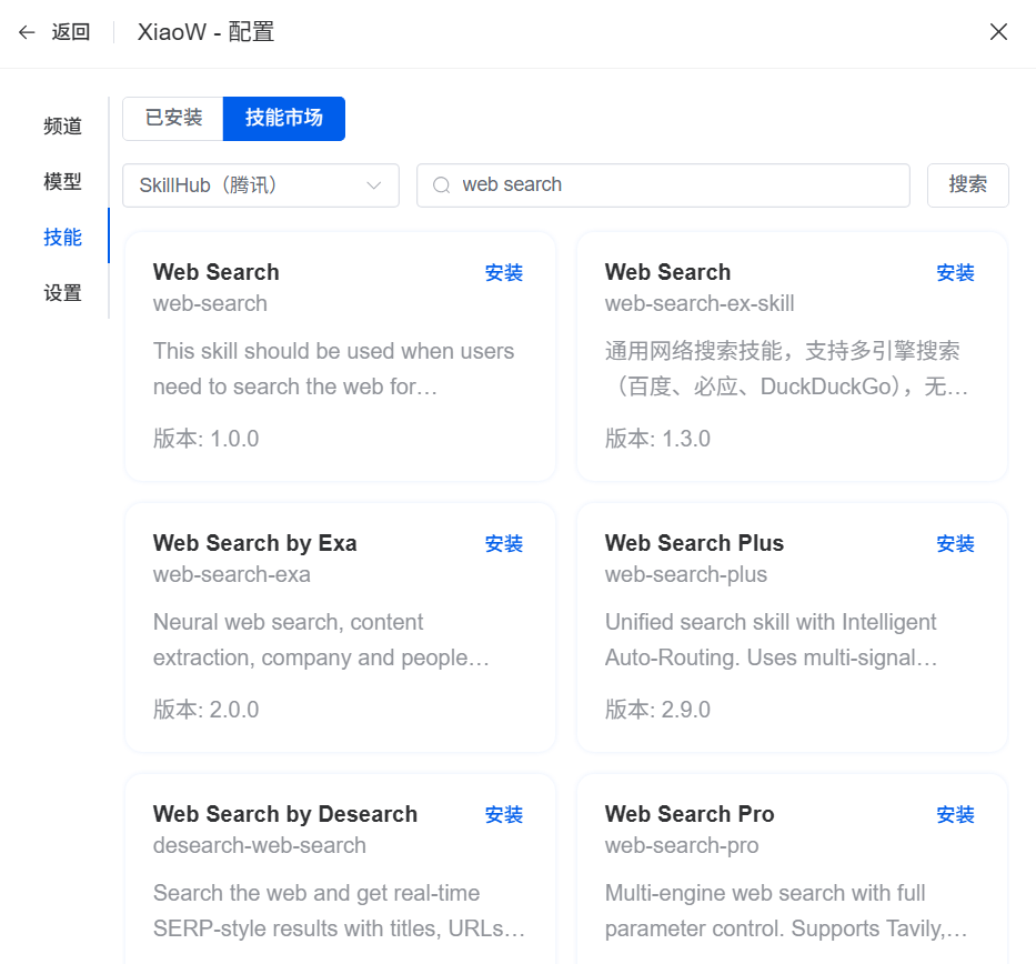 比如我想要让龙虾自动爬网获取知识,就搜索web search,得到了: