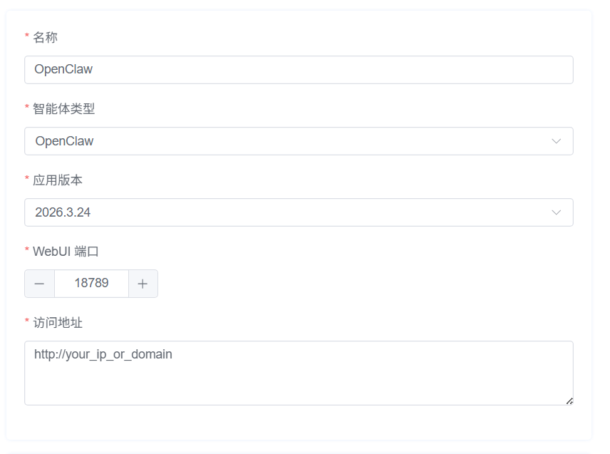 其中访问地址,改成你的服务器ip+webui端口,例如127.0.0.1:18789
