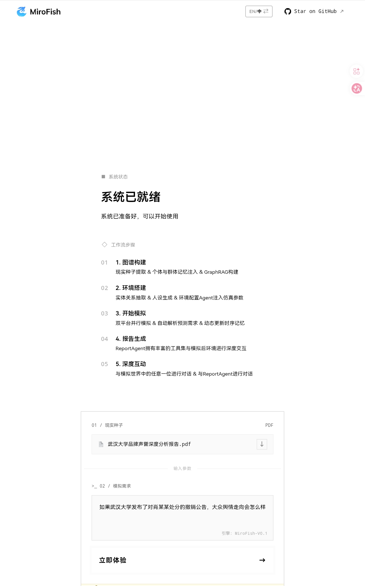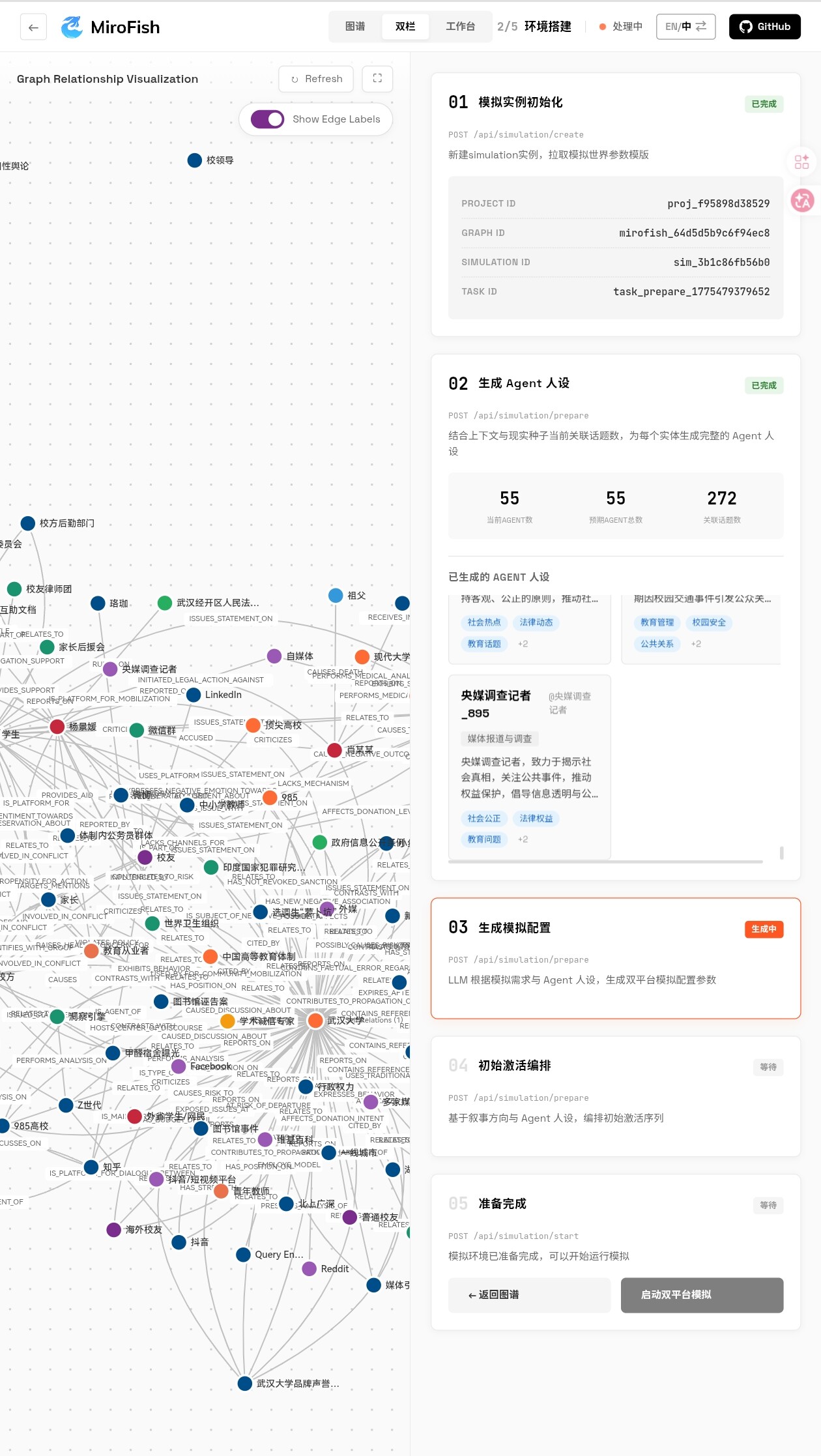 MiroFish 会自动做图构建、实体关系抽取、智能体生成与仿真等。