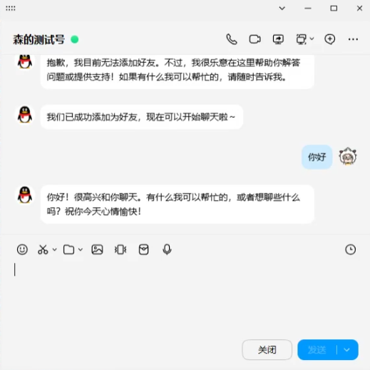 然后打开QQ,向登录的小号发送消息就可以和AI聊天了