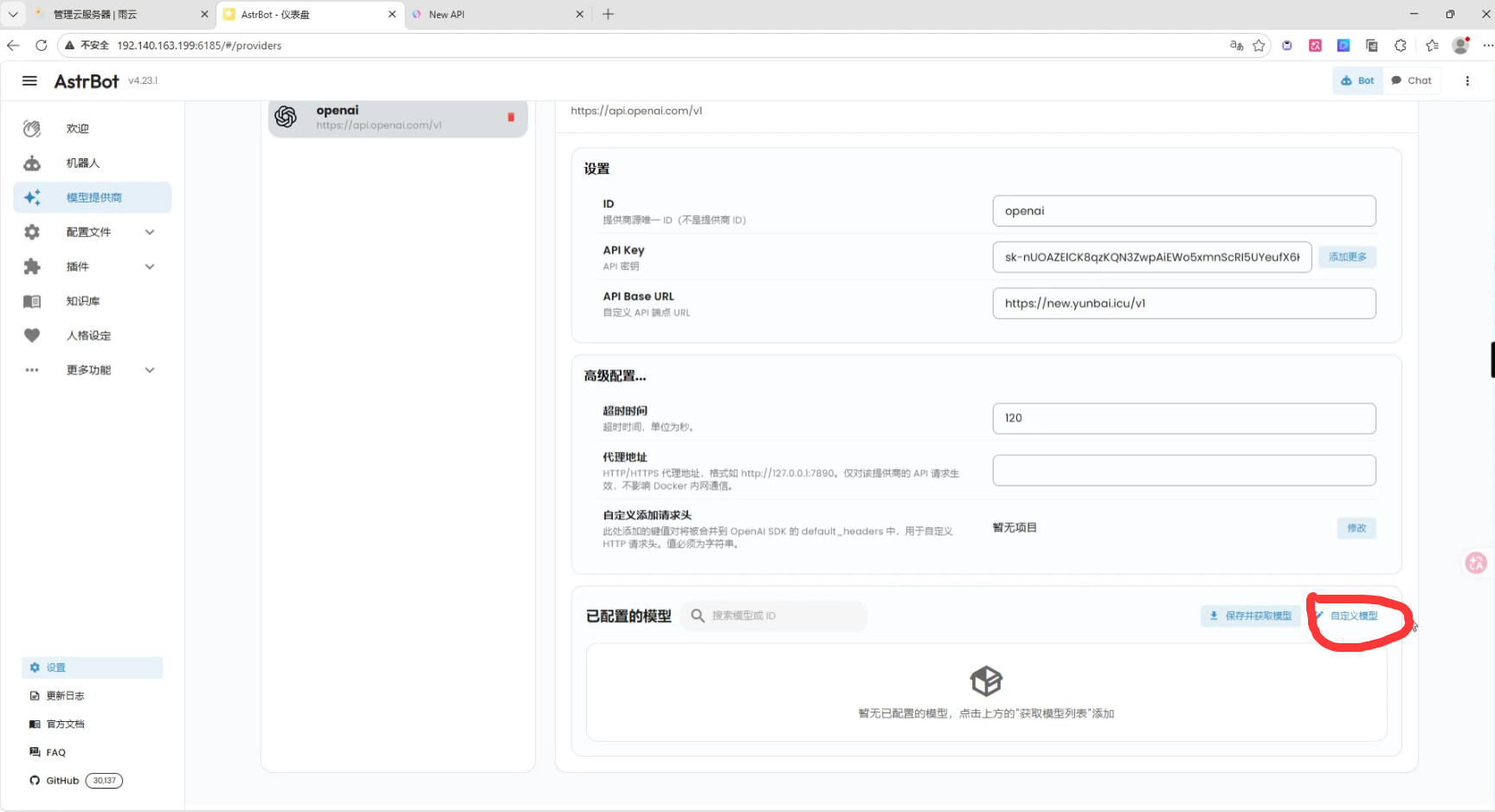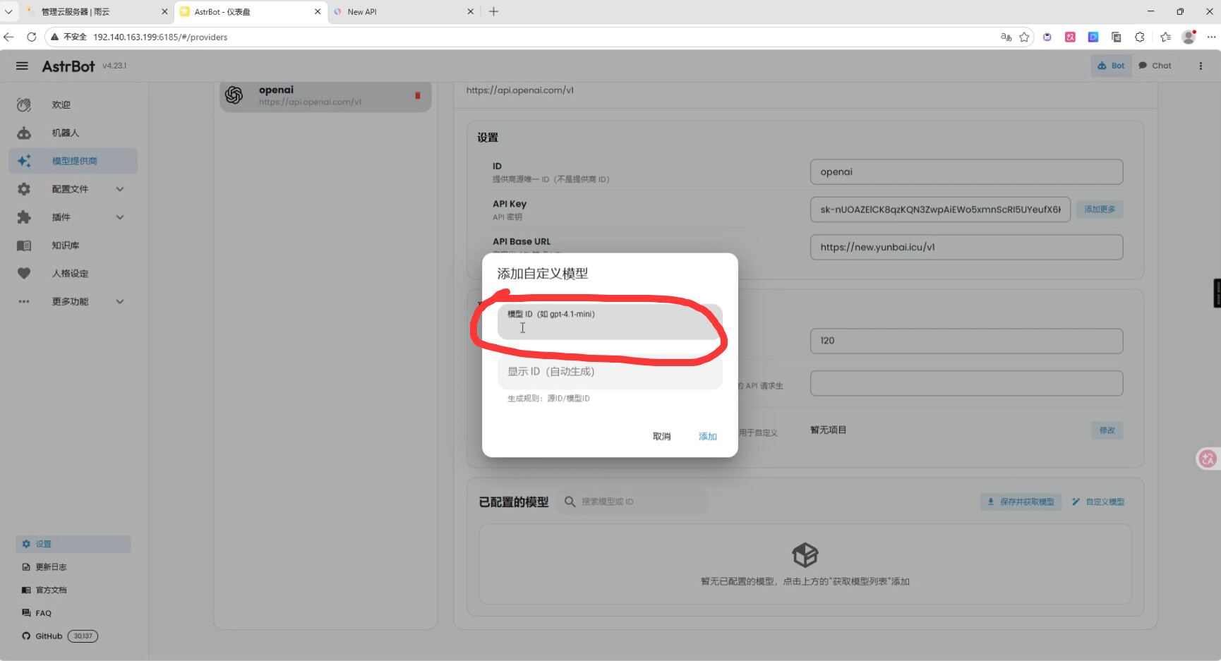 然后点击自定义模型,在第一个输入框粘贴模型提供商获取到的模型id