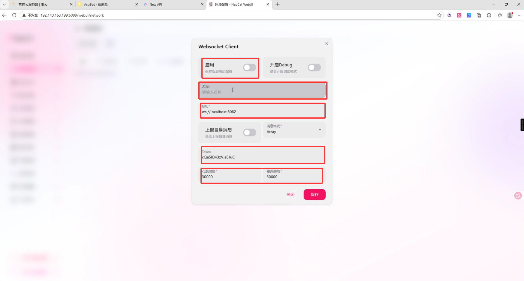 然后将token修改为在astrbot设置的token,心跳,重连间隔改为5000,名称随意,保存即可