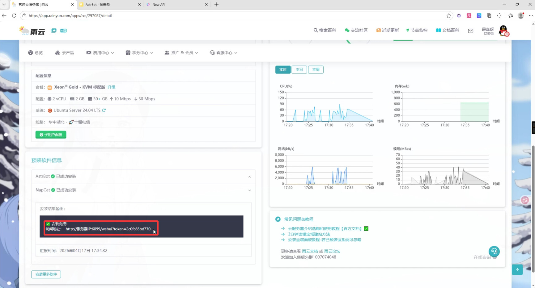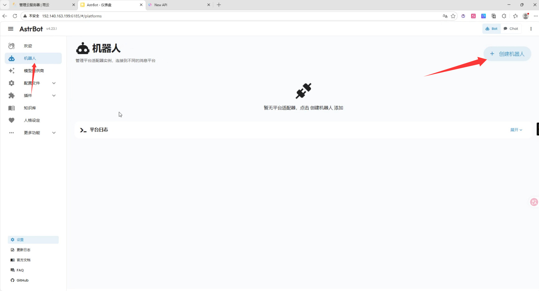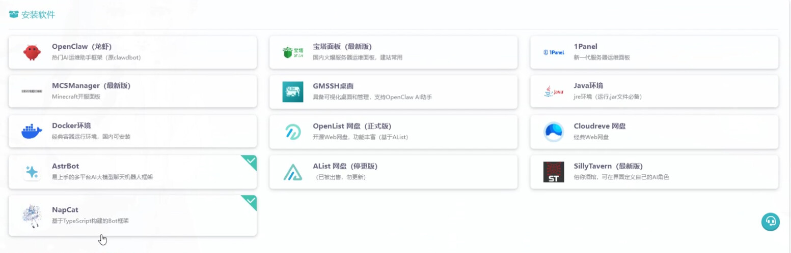 如果忘记预装,可以在控制台安装Astrbot和Napcat