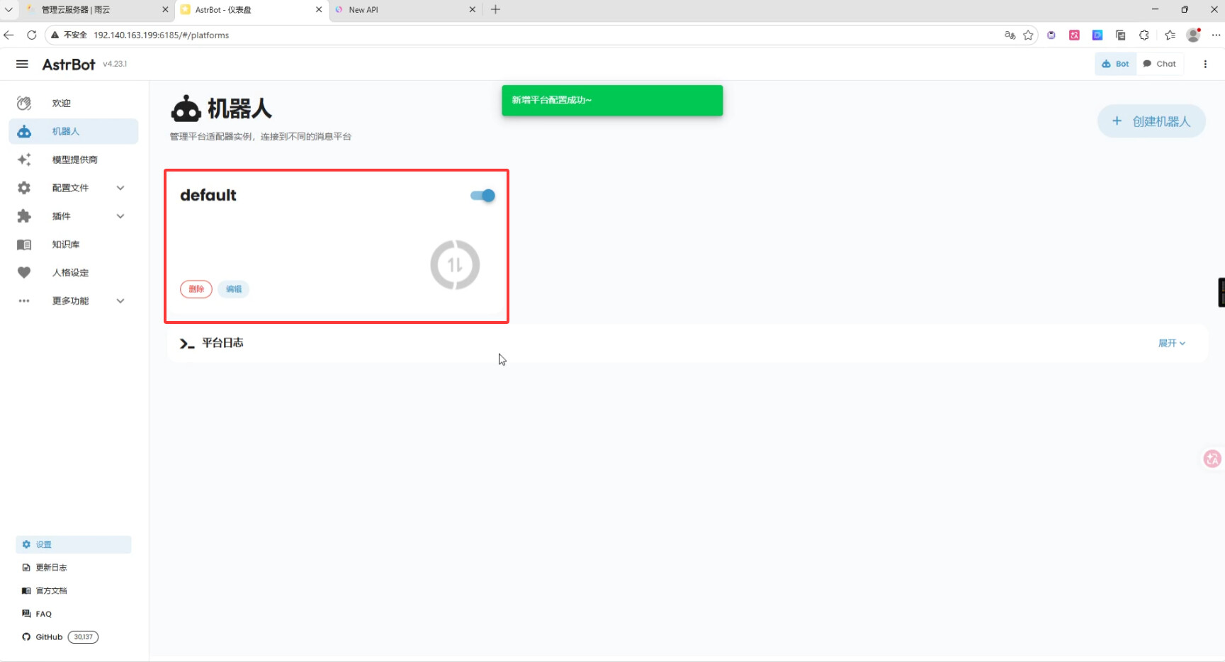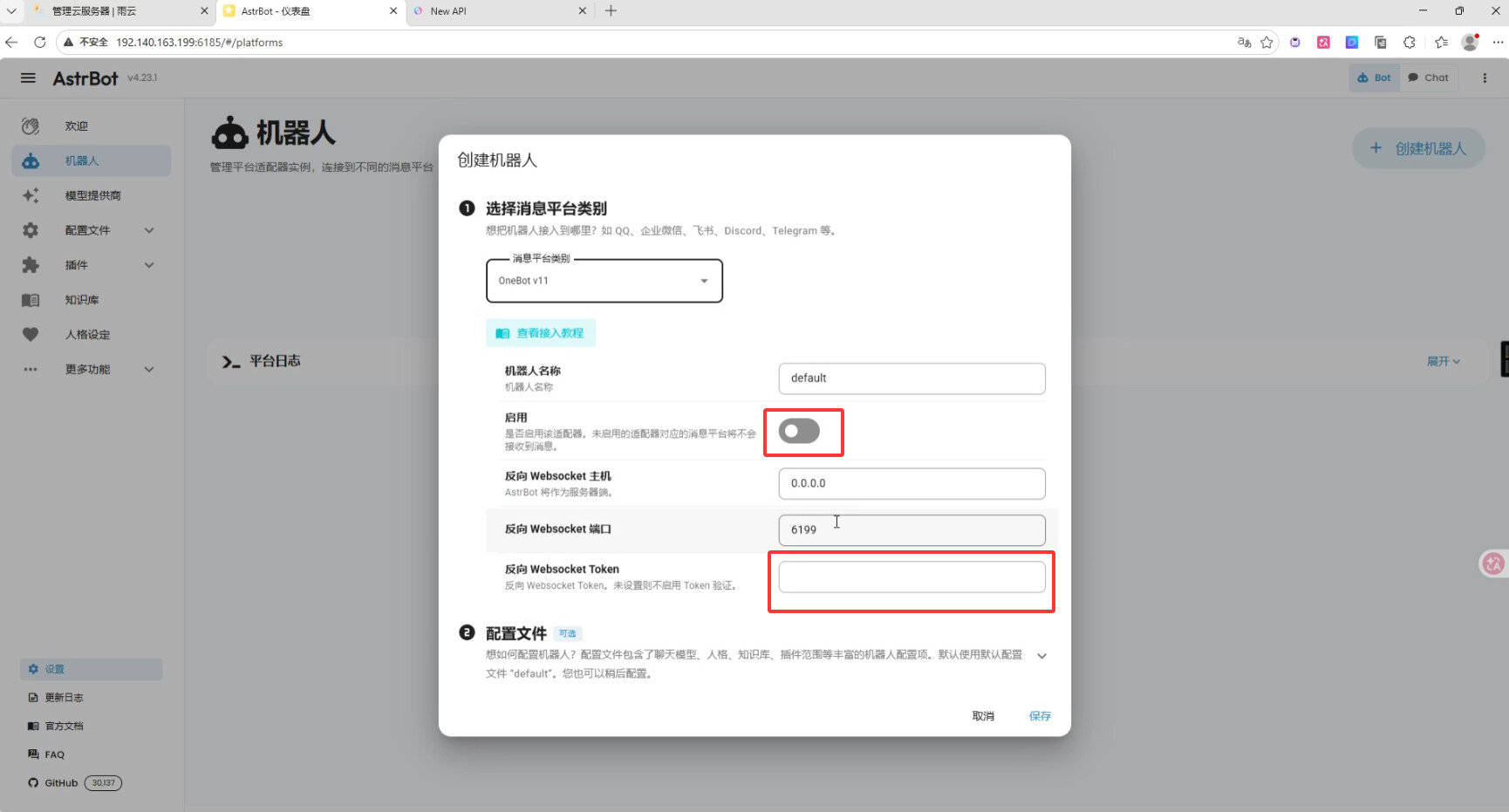消息平台类别选择onebot,把启用打开,设置一个复杂一点的token,其他可保持默认
