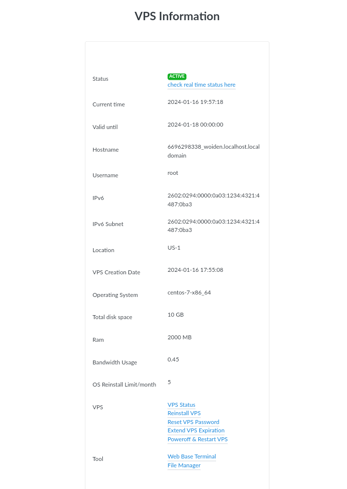 CREATE VPS就可以免费创建NAT VPS,等待几分钟后你就可以在:https://woiden.id/vps-info 页面看见NAT VPS的信息了,在VPS Information你可以看到你的IPV6等信息这里顺便介绍一下,这一些链接的作用