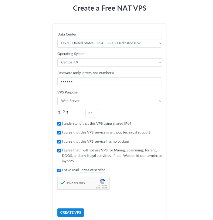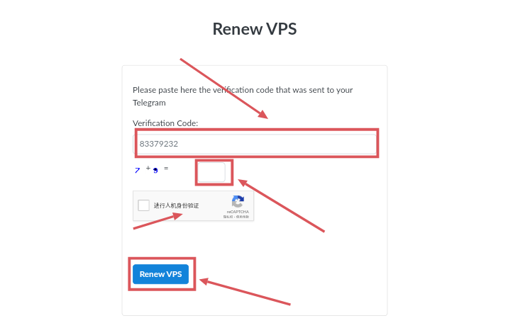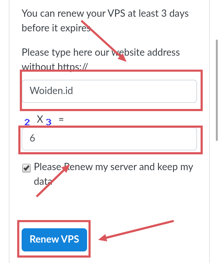 话说回来,进入延期界面后,你需要在第一个框输入Woiden.id,第二个框要计算一下加减乘除题,然后点击Renew VPS