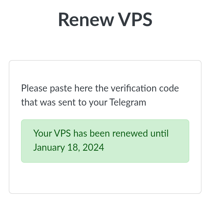 Renew VPS,如果出现以下页面就说明已经成功续期了,如果不是的话就说明人机验证没通过或者验证码错了(只要认证。几乎没有错误)最后